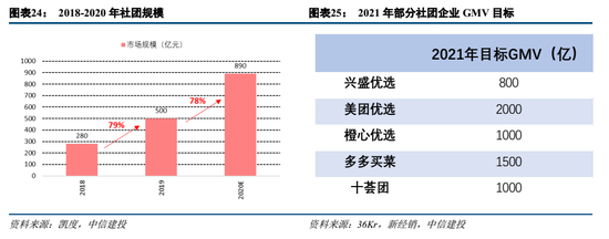 疫情加速社区团购行业发展,互联网巨头自20H2起纷纷布局,竞争激烈程度快速提升。根据凯度数据,2020年社区团购行业规模约900亿元,而根据36Kr报道的部分社区团购企业已公布的2021GMV目标测算,2021年行业规模有望快速跃升至6000亿左右。