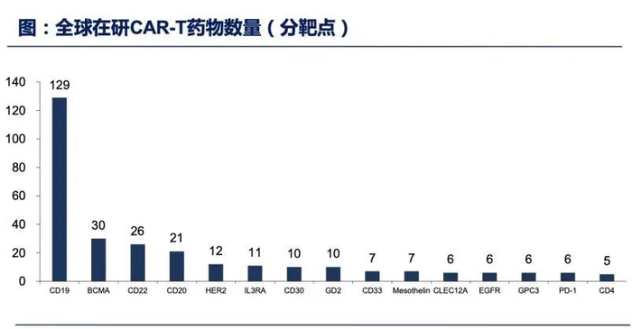 并且,CAR-T疗法也已出现靶点扎堆。目前CD19是最受欢迎的靶点,据华创证券研报统计,全球在研CAR-T疗法,有129项临床研究集中在CD19靶点,位居第二的是BCMA靶点,仅有30项,相差四倍不止。