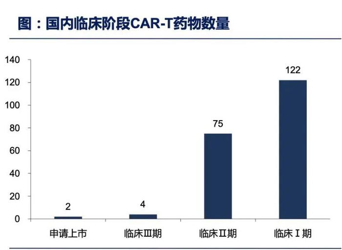 近年来,CAR-T已成为全球研发热点,中国的临床试验数量已超过美国,处于“井喷”状态。华创证券研报显示,国内处于临床阶段的CAR-T疗法,有122项处于I期临床,75项处于II期临床,4项处于III期临床。