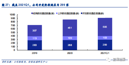 亚朵酒店采用轻资产加盟管理模式与租赁直营模式并行推动门店扩张。酒店利用强大的品牌声誉,分“加盟管理”与“租赁直营”两种经营模式,共同扩大业务,公司门店数量从截至2019年12月31日的420家增加到截至2020年12月31日的570家,截至2021年3月31日,进一步增加至 608 家,酒店网络覆盖中国131个城市,专注于中国的一线、新一线和二线城市,酒店客房总数从49087 间增加至2021年3月31日的71121间。其中,截至2021年3月31日,加盟管理模式下门店数量达到575家,加盟模式下并不直接负责经营,省去物业租赁与人员成本,轻资产的模式有助于公司快速展店。受到疫情影响,公司新增酒店数量增幅不大,2019年末、2020年末、2021年3月底公司处于“开发”阶段(即开业未满6个月,无法产生正常、稳定收入的门店)的酒店数量分别为283家、288家、299家。