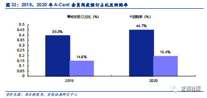 消费群体年轻化,利用会员制度增强用户粘性。年轻一代不仅是酒店和其他生活方式产品的消费主力,其购买力也在不断提升。招股书显示, 2020年亚朵30岁以下和20-40岁的客户群体分别占比24.3%和45.8%,而30岁以下客户的消费占据了总交易额的35.0%。亚朵通过推出A-Card制度提高用户忠诚度,截至2021年3月31日,A-Card会员累计超过2500万,2020年间夜消费占比44.7%,回购率为19.4%。利用App和微信小程序简化订房流程,拓宽营销渠道,2020年通过OTA预定的房间占总预定数的19.9%。