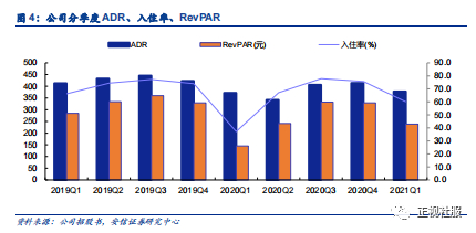 经营表现与房价表现均高于行业水平,疫情后期恢复程度较好。ADR:2019/2020年分别为429.5元/389.8元,2021Q1公司ADR环比下滑主要因为“就地过年”政策导致酒旅需求受到抑制,公司预计2021Q2/Q3随着疫情趋缓,ADR将逐渐提升。入住率:2019-2020年,亚朵入住率分别为73.4%和67.1%(不含疫情期间作为隔离点被征用酒店(下同),包含征用酒店的入住率为63.5%);2021年第一季度,亚朵入住率为60.0%(不含被征用酒店,包含征用酒店的入住率为59.4%)。RevPAR:2020年,公司所有酒店(政府征用中或临时关闭的酒店除外)的RevPAR为275.1元人民币,而国内中高端酒店行业平均RevPAR为197.8元人民币。公司2020年Q4所有酒店(政府征用中或临时关闭的酒店除外)的RevPAR为329.4元人民币,超过2019年同期水平。2021年4月、5月亚朵集团旗下所有酒店(政府征用中或临时关闭的酒店除外)的RevPAR恢复至2019年同期的108.0%、109.2%。