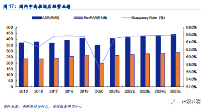 国内中高档酒店经营业绩保持稳健,未来趋势向好。根据弗若斯特沙利文,2015-2019年国内中高档酒店ADR从368元提升至405.8元,入住率从64.4%提升至65.5%,Revpar从236.5元提升至265.8元,经营保持稳健。2020年受疫情影响,各项指标均有明显下滑。随着疫情趋缓,酒店行业回暖,预计到2025年中高档酒店行业ADR、入住率、Revpar将分别提升至438.8元、65.9%、289.1元,整体趋势向好。