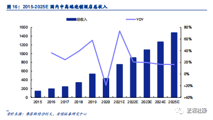 国内中高档酒店收入快速增长,2025年预计将达1477亿元。根据弗若斯特沙利文,国内中高端连锁酒店的总收入由 2015 年的人民币 143 亿元增加至 2019 年的人民币 534 亿元,复合年增长率为 39.0%,2020年由于疫情影响行业规模下滑19.1%至432亿元(同期中国整体连锁酒店收入下降36.8%)。预计2025年国内酒店收入将达1477亿元,2021-2025年均复合增速达18.4%。