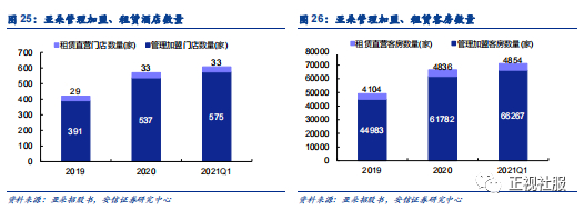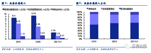 ■多品牌矩阵满足不同细分需求, 轻资产加盟模式扩大酒店网络,发力场景零售打造生活方式品牌。亚朵旗下拥有亚朵(旗舰)、亚朵S、亚朵轻居、亚朵x、ZHOTEL等品牌,不同品牌定位于不同消费群体与场景,通过多样化满足客户差异需求。亚朵酒店采用轻资产加盟管理模式与租赁直营模式并行推动门店扩张,截至2021年3月末,管理加盟酒店575家(客房66267间),租赁直营酒店33家(4854间),公司主要通过管理加盟模式实现酒店数量扩张,处于开发阶段的酒店合计299家。管理加盟模式下,亚朵会向加盟商按每间房4000元至6000元收取首期加盟费用及有关的开张前服务有关费用。加盟酒店开始经营后,亚朵每月按加盟酒店总收入收取5%至6%不等的加盟管理费,并就派驻酒店经理、提供的酒店供应品及其他相关服务收费。在一般酒店管理业务之外,公司发力场景零售打造生活方式品牌,覆盖衣、食、住、行、娱乐等品类,截至2021Q1共有1136个场景零售SKU,消费者可以在入住期间亲身体验亚朵的产品,如果他们对产品感到满意,只需在手机上对产品进行简单的扫描,就可以跳转到电子商店进行购买。2019年/2020年/2021Q1零售业务产生的GMV分别为0.83亿元/1.07亿元/0.33亿,每间客房零售预订平均交易金额达到517.5元。