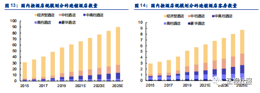 按酒店客房数量口径,中高档酒店在连锁酒店中渗透率预计将从2020年的10.5%提升至16.1%。根据弗若斯特沙利文,2020年国内连锁酒店客房数量中,经济性、中档、中高档、高档及豪华酒店客房数量分别为290万、120万、60万、70万、30万间,2015-2019年中高档酒店客房数量复合平均增速为25.7%,同期连锁酒店行业整体为15.2%。预计2021-25年中高档连锁酒店客房数量复合平均增速为18.9%,高于行业整体8.8%的增速。而中高档酒店客房的渗透率也将从2020年的10.5%提升至16.1%。