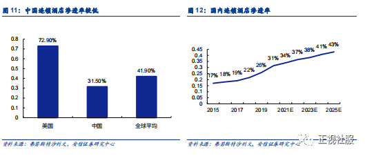 中国酒店业分散,单体酒店众多,大型连锁酒店数量少。根据弗若斯特沙利文统计数据,截至2020年12月31日,国内单体酒店与连锁酒店的数量分别为41.8万、6.1万间,单体酒店与连锁酒店的客房数分别为1240万、570万间。连锁酒店的酒店客房占中国酒店客房总数的比例仅为31.5%,远低于全球41.9%的平均水平和美国72.9%的比例。连锁酒店凭借更好的品牌、管理和资金优势,未来渗透率将逐渐提升。弗若斯特沙利文预计, 2025 年中国连锁酒店渗透率将提升至 42.9%。