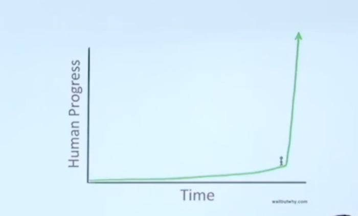如果我们把它画一张图(如下),人类的Progress现在发生了一个拐点,怎么去判断未来的发展趋势,在这个时候我们经常会有一些误区,首先就是用线性思维去看指数增长的世界。因为科技具有自我连接性,它会在节点里面发生网络效应,它的结果符合梅特卡夫定律,它是节点数的平方。比如互联网,最典型的就是产生了一个指数的增长。