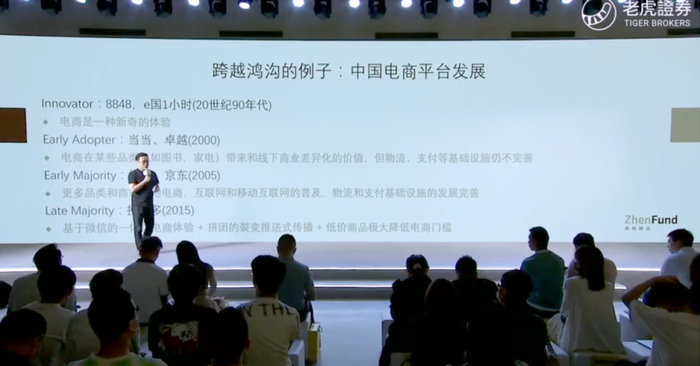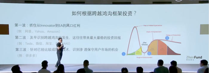 戴雨森很喜欢《跨越鸿沟》这本书,英文叫《Crossing The Chasm》,这是上个世纪90年代的书。它对新科技、新技术怎么扩散、科技创新的框架进行了很深入的分析,可以用来指导关于科技股的投资。