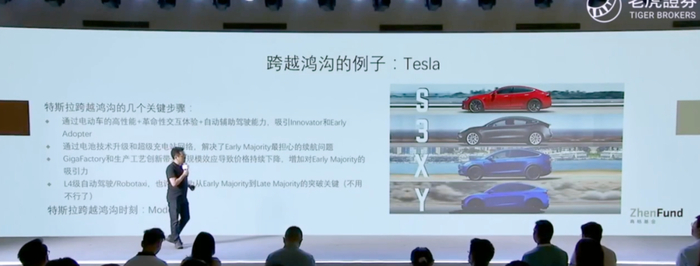 然后通过不断的降价,他们搞了一个GigaFactory,用了非常多的先进生产技术,比如说超大型压铸机去做特大机车身生产,把时间成本降下来、整体成本降下来,价格下来之后,Early Majority就会发现充电问题解决了,内饰品质也提高了,价格也降下去了。