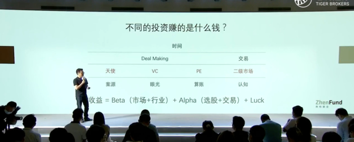 一级市场都要赚Deal Making的钱,天使投资赚的是案源的钱、VC靠的是眼光、PE阶段靠算账能力,而二级市场靠的是交易技巧,当然这里面还有一个最顶层的——赚时间的钱。所以我们做不同的投资,首先要想清楚赚的是什么类型的钱。