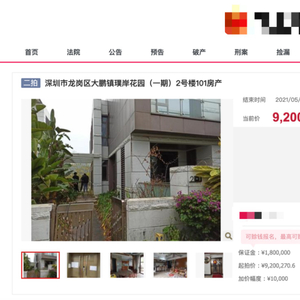 上面提到的别墅位于深圳龙岗区大鹏镇璞岸花园。阿里拍卖网显示,该别墅的核准登记日期为2017年7月26日,房产登记价为1550万元。