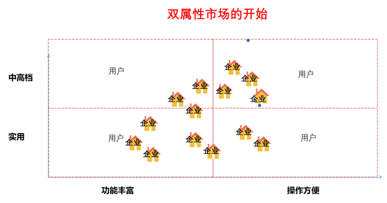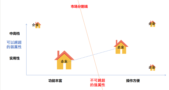 相反,如果「功能丰富程度」是强属性,「档次」是弱属性,那么「双寡头」的市场就是按「功能丰富程度」这个属性进行市场分割。