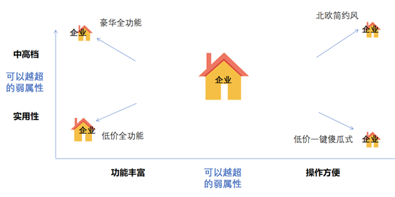 比如「企业A」选择了「实用性」,一旦竞争策略得当,被市场认可,规模迅速扩大,拥有了强大的竞争力。那么,从产品定位的角度,企业B最容易避免激烈竞争的定位就是站在「中高档」这一边,并且也在「功能丰富——操作方法」中选择中间的位置。
