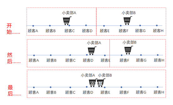 于是小卖部A搬到了街中心的位置,小卖部B的生意自然就下降了,于是小卖部B也搬到街中心,跟小卖部A靠在一起。