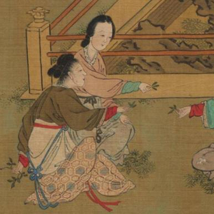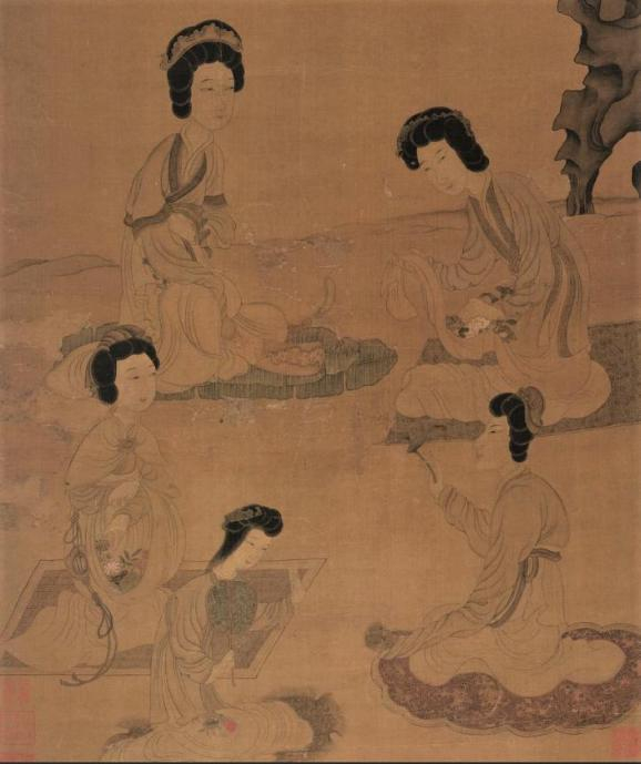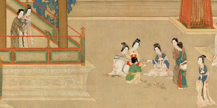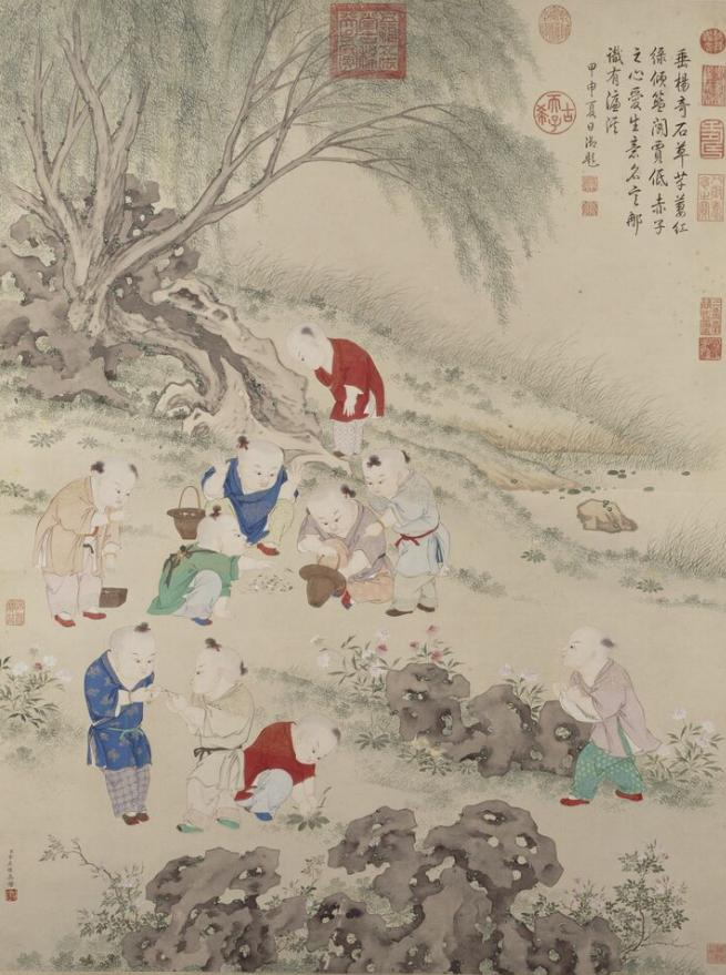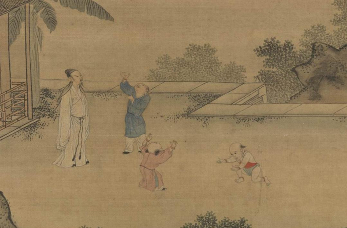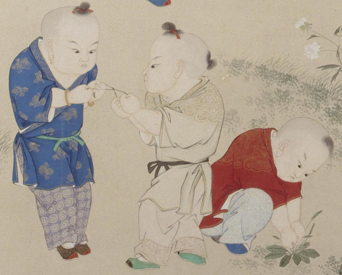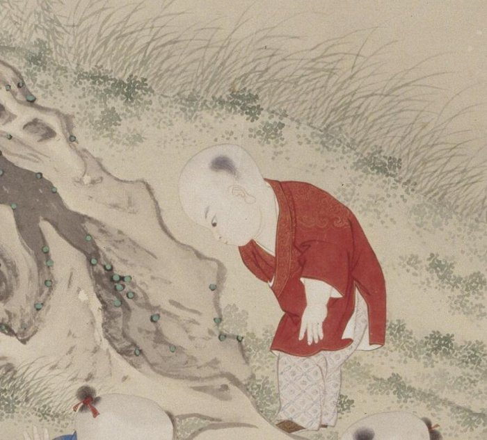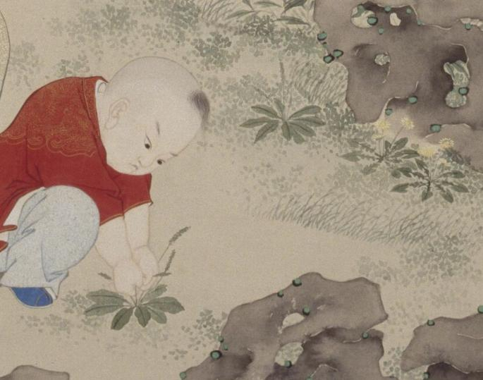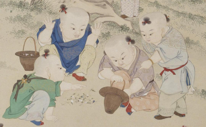 在他身后,蓝衫、绿衫、紫衫、浅衫小童围成一圈,斗草斗得正酣。他们中间空地上堆满了花草,看样子是绿衫小孩数完了他采集到的所有花草,轮到对面的紫衫小孩。紫衫小孩坐在地上,从编制精美的小花篮里把他的花草往外掏。