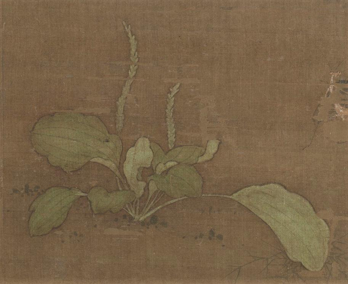 一个红衣服小孩蹲在地上采一棵车前草。看来这小孩的斗草经验很丰富,掌握了斗草的诀窍,那就是车前草。