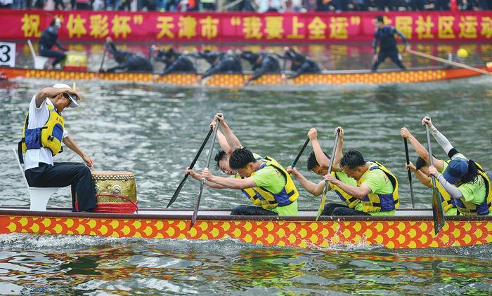 14日是端午节,海河龙舟赛在天津大光明桥至保定桥区间水域举行。本次比赛吸引了来自德国、法国、西班牙、意大利等国家驻津企业代表队和国内高校及市民、企业组织代表队,共34支龙舟队参赛。图为参赛龙舟队员在比赛中。