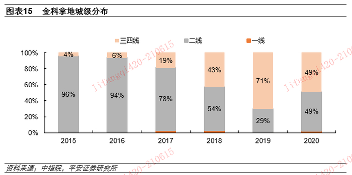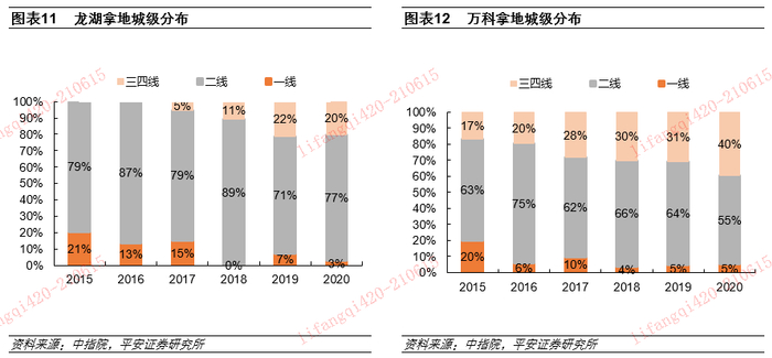 从拿地城级分布看,龙湖与招蛇均聚焦一二线,万科、保利、金科三四线占比更高。据中指院不完全统计,2020年龙湖、万科、保利、招蛇、金科一二线拿地建面占比分别为80%、60%、51%、77%、51%。考虑一二线城市兼具人口与产业优势、居民购房需求充足,龙湖坚持聚焦一二线城市,土储项目更加安全优质。