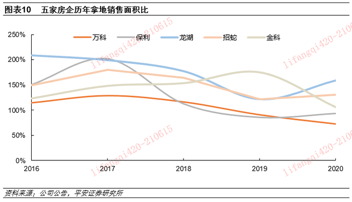从拿地规模看,龙湖近年投资积极,为销售增长补充弹药。2016-2020年,龙湖集团拿地销售面积比均超过120%,其中2020年为159%,在五家房企中排名首位。