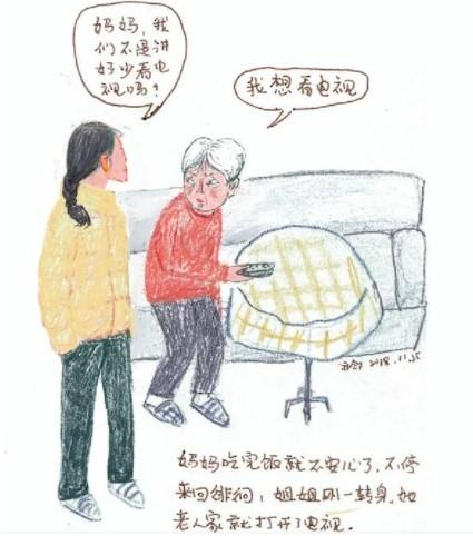 尽管姐姐知道妈妈的病是不可逆的,但姐姐仍然抱有很高的期待,她积极地照顾妈妈,严格地执行给妈妈的训练方案:书法,绘画,写日记,读书,念绕口令……一旦看到妈妈的情况没有好转甚至还在下滑,她就会感到难过和失望。一种无形的压力和牵绊令姐姐窒息,而这些负面情绪自然也传递到了妈妈那儿,这是一个恶性循环。