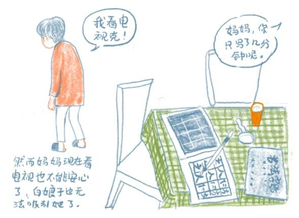 有时候妈妈表现得像个乖孩子般,特别让人心疼。小时候我们会趁家长不在家的时候偷偷看电视,现在妈妈也会趁姐姐不在偷偷看电视。以前是妈妈监督我们看电视,现在反过来了。