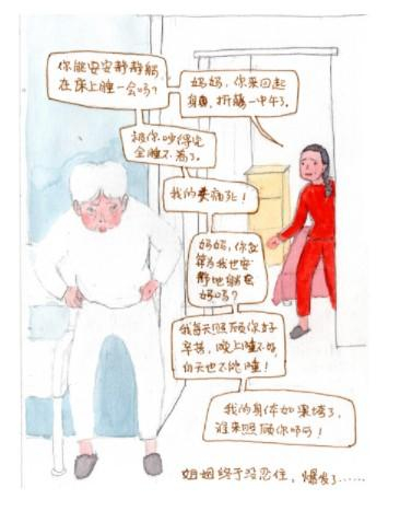 在照顾妈妈的过程中,姐姐的情绪常常在充满信心-烦躁-自我否定-焦虑不安-沮丧-爆发中来回徘徊。虽然她用做瑜伽、冥想等方式来释放负面情绪,但长期面对妈妈这样的病人,没有个人空间,还是会感到压抑。