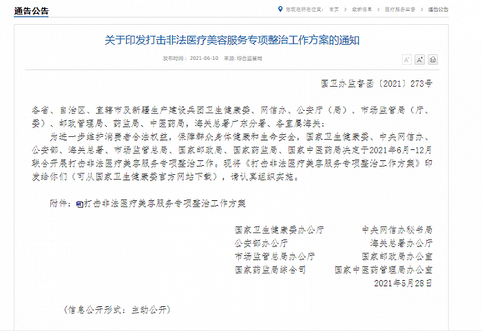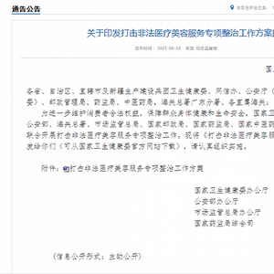 6月10日,国家卫生健康委、中央网信办、公安部、海关总署、市场监管总局、国家药监局等八部委联合印发《打击非法医疗美容服务专项整治工作方案》(下称《工作方案》),决定于2021年6月至12月联合开展打击非法医疗美容服务专项整治工作。