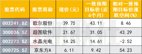 以上个股中,有4只近半年内获机构给出目标价,其中京东方A目前距一致预期目标价仍有50%的涨幅空间;超图软件距一致预期涨幅空间超40%。