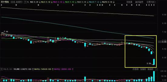 在日K线图上,苏宁易购也非常难看:自5月28日以来12个交易日,竟有11根K线未收出阳线。今日的跳空跌停,更是击穿了早在2014年5月时候的低点,创出了自2013年8月以来近8年的新低!