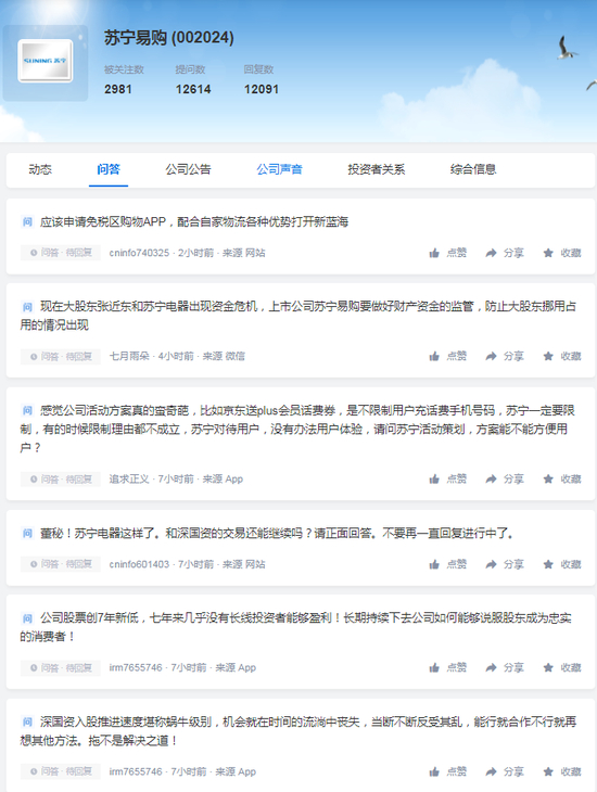牛眼君(每经牛眼:njcjnews)注意到,面对股民们的质疑和感慨,苏宁易购方面保持着尴尬的沉默。截至发稿时,自昨日晚间“爆雷”公告发出之后,深交所互动易上有多达近20条的投资者向苏宁易购提问或是提出建议,但公司没有作出任何回复。