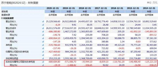 Wind数据显示,自2014年年报以来,苏宁易购已经连续7年扣非归母净利润出现亏损,最新的2020年年报扣非归母净利润亏损高达68亿元。