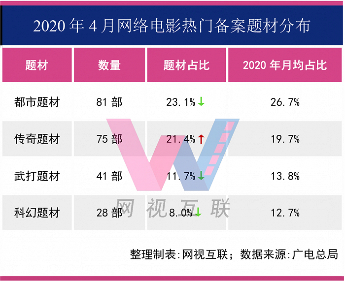 在通过备案的350部网络电影中,都市题材81部,传奇题材75部,武打题材41部,科幻题材28部,其中传奇题材数量有所上升,而科幻题材下降最为明显。