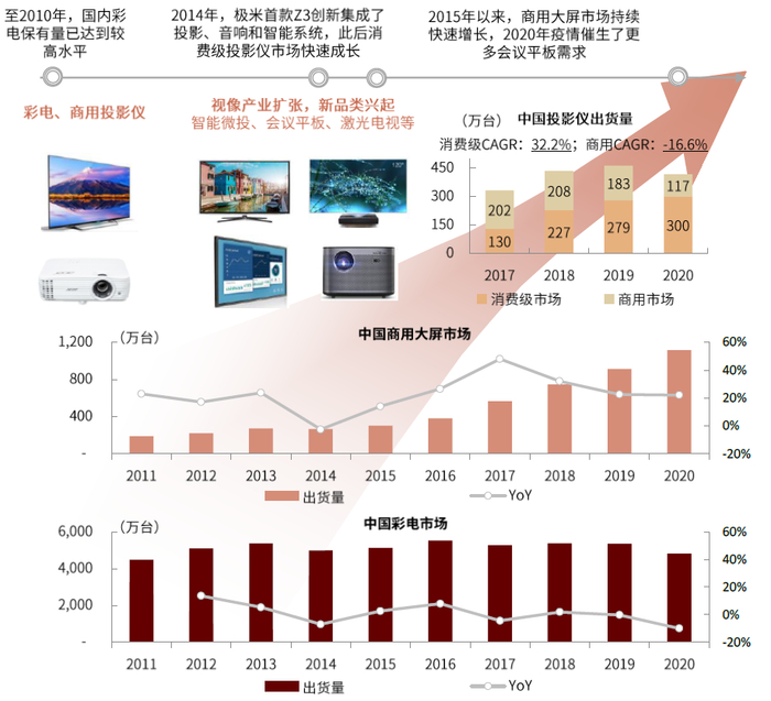 技术进步和产业升级推动智能微投、办公智能大屏等新兴赛道快速崛起:1)2020年,消费级投影仪(智能微投、激光电视)出货量达到300万台,是商用投影仪出货量的2.6倍,2017-2020年CAGR达32.2%。2)2010年以来,办公智能大屏正在逐步取代商用投影仪成为主流,2020年中国商用大屏市场规模达1115亿元,2011-2020年CAGR为21.9%。
