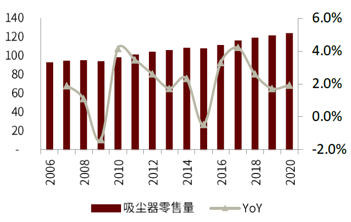 图表:2006-2020年全球吸尘器零售量及YoY
