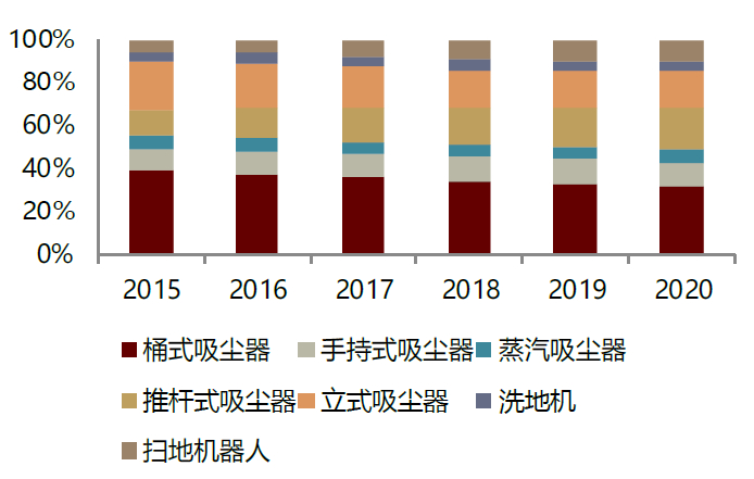 图表:全球吸尘器市场不同品类零售量占比