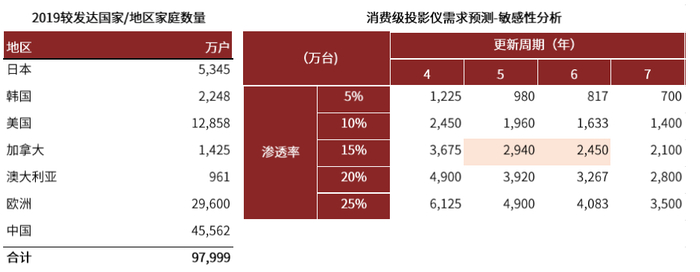 我们假设在全球较发达国家/地区智能投影仪渗透率可以达到15%,产品更新周期5-6年,则全球消费级投影仪市场空间2450~2940万台/年,对比当前市场有7~8倍空间。