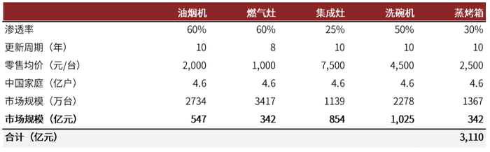 我们测算,未来大厨电市场整体零售规模有望达到3000亿元以上,其中集成灶、洗碗机有望成为规模最大的厨电单品,达到千亿级别的零售规模。