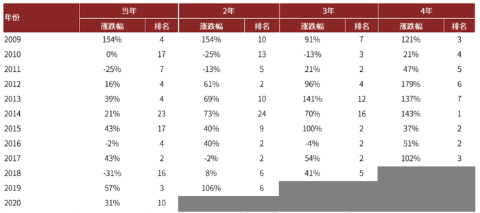 注:收益率为假设当年1月1日投资后至年底、第二年年底、第三年年底、第四年年底的收益率。