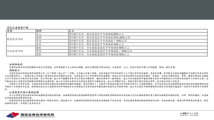 本报告版权归国信证券股份有限公司(以下简称“我公司”)所有,仅供我公司客户使用。未经书面许可任何机构和个人不得以任何形式使用、复制或传播。任何有关本报告的摘要或节选都不代表本报告正式完整的观点,一切须以我公司向客户发布的本报告完整版本为准。本报告基于已公开的资料或信息撰写,但我公司不保证该资料及信息的完整性、准确性。本报告所载的信息、资料、建议及推测仅反映我公司于本报告公开发布当日的判断,在不同时期,我公司可能撰写并发布与本报告所载资料、建议及推测不一致的报告。我公司或关联机构可能会持有本报告中所提到的公司所发行的证券头寸并进行交易,还可能为这些公司提供或争取提供投资银行业务服务。我公司不保证本报告所含信息及资料处于最新状态;我公司将随时补充、更新和修订有关信息及资料,但不保证及时公开发布。