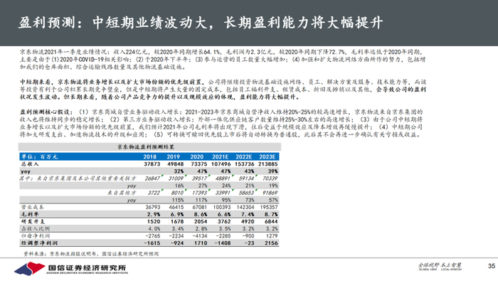 我们认为京东物流是具有长期投资潜质的公司,一是因为公司成长空间大。公司所在的一体化供应链服务市场空间巨大,规模约2万亿元,现阶段行业集中度低,而该市场规模效应较强,京东物流是该市场的龙一,市占率不到3%,未来公司的市场份额还有很大的提升空间。二是公司未来3-5年业绩增长驱动力足。驱动力一来自于一体化供应链服务市场的可持续增长;驱动力二来自于京东集团将贡献稳定增长的业务;驱动力三来自于公司向第三方开放后快速拓展外部客户;驱动力四来自于降本增效和技术运用;驱动力五来自于收购兼并。三是公司具有核心竞争力。相较竞争对手顺丰和菜鸟,京东物流的仓配产品和仓储资源具有明显优势,且公司技术投入大,公司的以仓配为基础、技术赋能的一体化供应链服务在市场上具有很强的竞争力。我们预计公司2021-23年实现归母净利润-22.9/-9.0/12.8亿元,短期合理市值2000亿元左右,中长期市值有望超过3500亿元,首次覆盖,投资评级为“无评级”,建议积极关注。