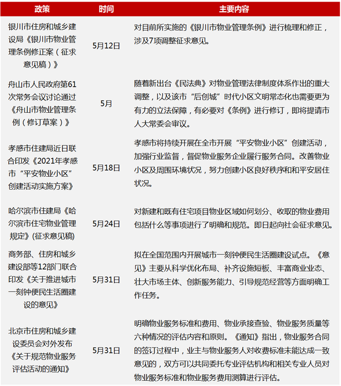 政策层面:本月,北京、银川、舟山和哈尔滨修订和规范了物业管理条例,细化了物业服务、管理与评估规则,进一步推动了物业行业走向规范化发展。另外,商务部等12部门近日联合下发《关于推进城市一刻钟便民生活圈建设的意见》。意见提出合理优化网点,重点对城镇老旧小区、新建居住区、城乡结合部小区加强商业网点布局。有利于满足居民便利生活和日常消费需求,快速发展便民生活圈。