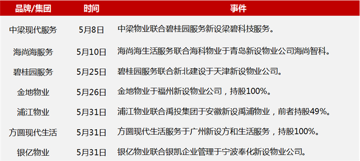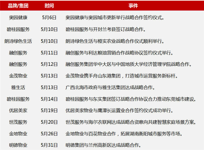 合作方面:5月,奥园健康、碧桂园服务、朗诗绿色生活、融创服务、优居美家、世茂服务、金地物业、明德物业等均积极展开战略合作。其中,碧桂园服务、雅生活、明德物业等众多品牌还与政府、院校等合作开展业务,通过整合资源,聚焦细分领域,有望深耕运营服务市场。