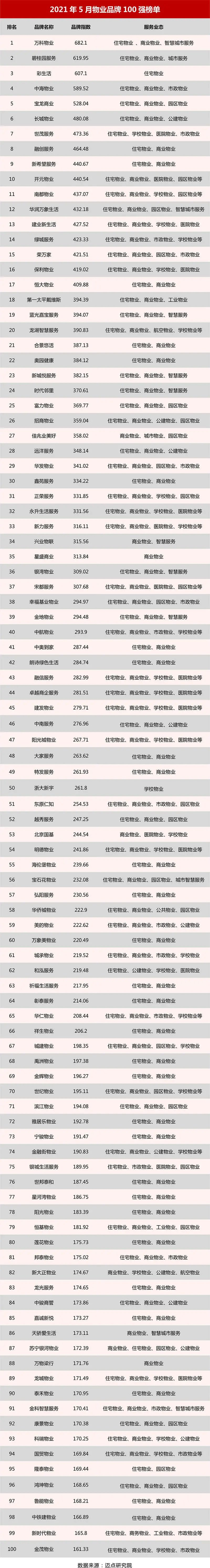2021年5月物业品牌100强榜单发布