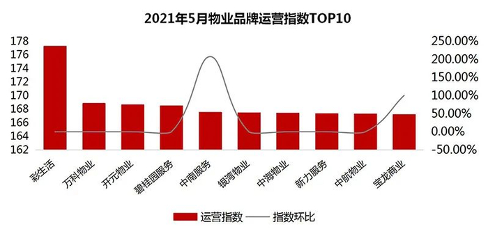 5月运营指数排名前十的依次是:彩生活 、万科物业、开元物业、碧桂园服务、中南服务、银湾物业、中海物业、新力服务、中航物业和宝龙商业。其中,运营突出表现品牌为中南服务,其运营指数达到167.53,环比上升207.56%,排名位于运营指数第5位。