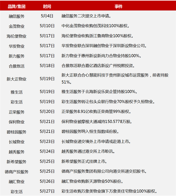 5月,新希望服务正式上市,物企赴港上市门槛提高,物业管理行业将加快并购整合。
