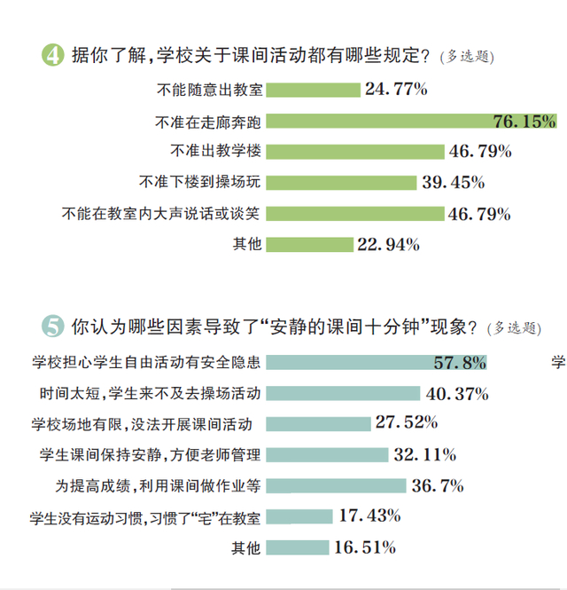 调查数据显示,超7成家长表示,自己孩子所在的学校关于课间活动有相关规定,如不准在走廊内奔跑和不准在教室内大声说话或谈笑等。不少家长表示,孩子课间主要是外出喝水、上厕所,或者在教室内看书、写作业。