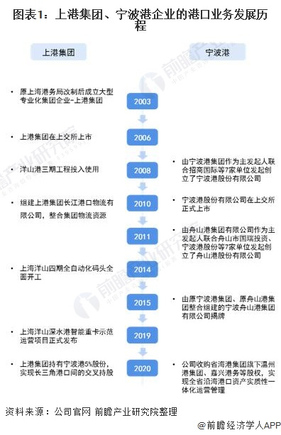 中国拥有全球第一大货物吞吐港口——宁波舟山港、第一大集装箱吞吐港口——上海港,而宁波港(601018.SH)(为区别于宁波港口,以下简称宁波港企业)、上港集团(600018.SH)分别是上述两大港口的主要运营主体,以较大的体量规模优势位居行业龙头地位。两家企业的港口业务布局历程如下:
