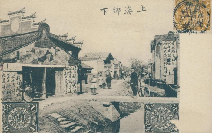 另一张题为“上海乡下”的明信片,已难以追溯是上海乡下的哪个地方,左侧前面一幢建筑的山墙与今日上海建筑中的山墙样式相去甚大,这种山墙俗称“观音兜”。大概是它的样子像佛教造型中观音菩萨身披的兜蓬相似,才会有这样的名称。民间认为,观音菩萨一手持一瓷瓶,一手持一细柳枝,只要她用柳枝蘸上一点水,顺手一洒,天下就会下瓢泼大雨。所以,把建筑山墙建成观音兜的形状,用于厌胜,可以防止火灾。虽是瞎三话四,却十分有趣。“观音兜”曾是上海建筑的特色,很多地方都可以看到。如今,在崇明竖新镇仙桥村,还能看到一两幢老式民房保留着这种建筑样式,其它地方已经很少见到了。
