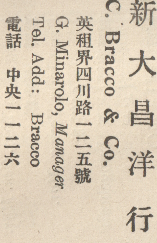 新大昌洋行(Bracco & Co. ,C)是一家意大利商行,由意大利商人勃拉高(C. Bracco,后来也被译为布拉科)于1900年创办于上海。最初行址在九江路,1904年接办法商大昌洋行(Gaillard Jeune, J.)的进口业务,1906年迁至四川路8号。该商行主要经营意大利、法国、美国的葡萄酒、烈酒、果品、包装食品等的进口、批发贸易,中国古玩、兽皮、茶叶等的出口业务,还代理欧洲多国的多家公司在华业务,并在上海的多处设有商品陈列柜。